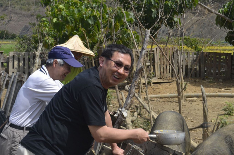 沈董事長夫婦與基金會董事:賀陳旦夫婦、洪嫣紅夫婦、李文彬夫婦等與大亞其他同仁一行十餘人,23日早上來到彩虹農場,受到洪老師與農場工作人員的熱情歡迎。洪老師向來賓們逐一解釋農場規劃的理念,雞鴨鵝豬的養殖如何與農作物的種植,如何形成互利的循環體系,降低環境負荷。眾人對於乾式豬圈的乾淨、無異味,更是嘖嘖稱奇。