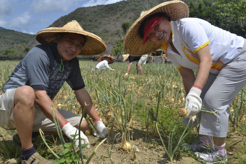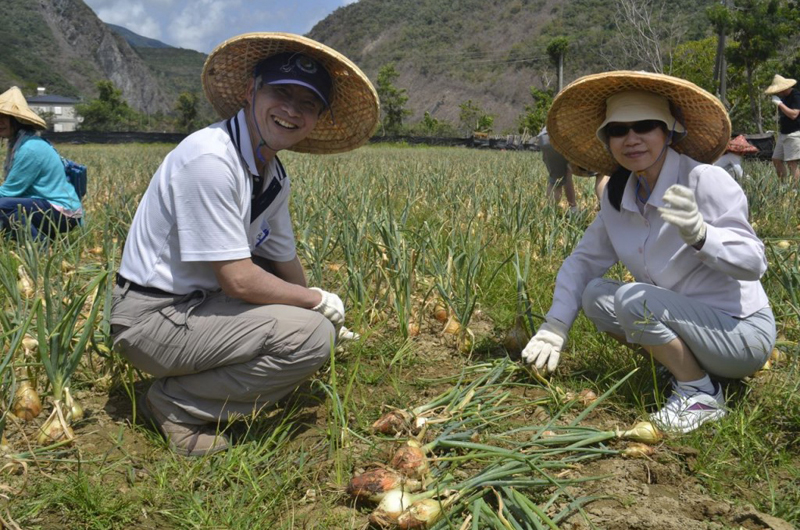 (沈董事長夫婦一馬當先,在烈陽底下採收洋蔥。)