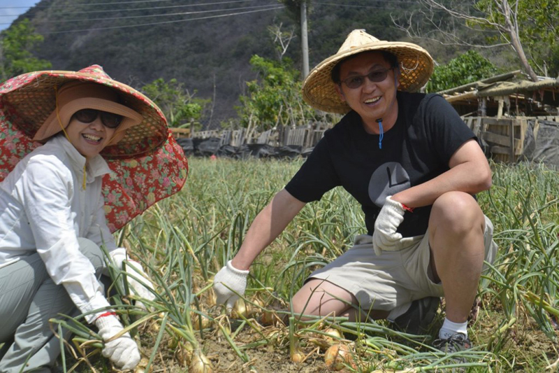 (洪嫣紅董事夫婦的合影,手上的洋蔥長得非常漂亮,其長大的過程對於水分十分敏 感,多虧了綠農的家的細心照顧,這些洋蔥看起來非常健康!)