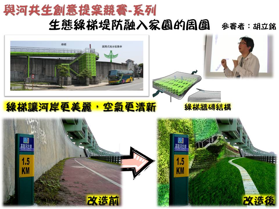 生態綠梯堤防是甚麼?顧名思義,即兼具「跨堤親水」、「綠色植栽景觀」與「雨水回收系統」的多功能跨堤設備。面積1平方米的植物能同時為1人提供充足氧氣,若能開發出生態綠梯牆磚,並且應用於防洪牆,台北市的防洪牆約51,268公尺加上堤防高度,約有面積62萬平方米,生態綠梯堤防上這些植物,就能同時為62萬人提供充足氧氣。除此以外的優點有:都市的綠化率、美化、減少光輻射、消除熱島效應、固定二氧化碳、淨化空氣、調節截留雨水、創造生物棲息環境、提供休憩、療癒、教育與園藝生產空間等。