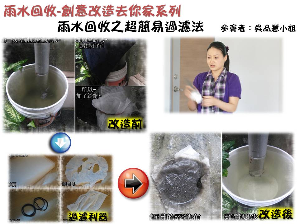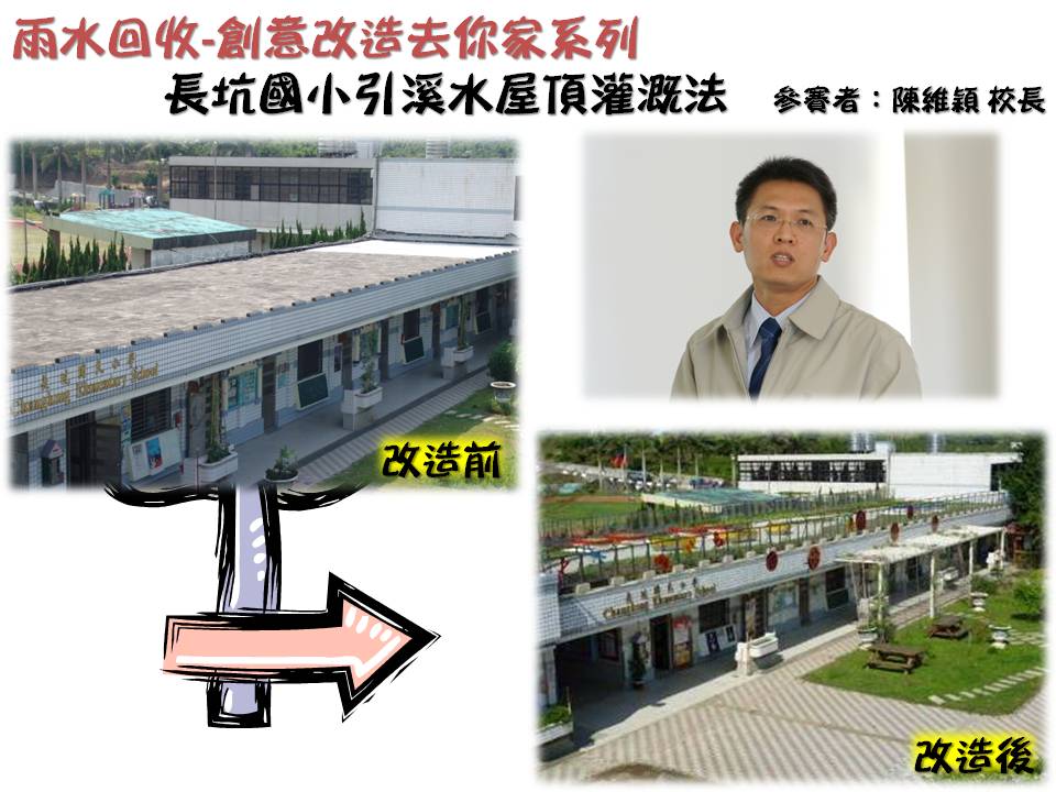 長坑國小鄰近八里台北港,依山傍海風景非常漂亮,陳校長的校園設計將紅水仙溪的溪水引入學校,藉由抽水馬達(使用風力發電)將溪水抽往教室綠屋頂灌溉,現在綠屋頂不僅成為學生解說的招牌地點,並且校長發現營造了綠屋頂之後夏季教室溫度下降了攝氏兩度、冬季時上升了攝氏6度,正可謂冬暖夏涼,讓學生上課狀況更好了。雨水回收有多簡單?品慧說:只需準備一個桶子,就可以開始了。品慧家裡種了許多植物,每次澆灌都要用掉十幾公升的水,並仗著愛護地球的熱情開始創意發想,品慧分享超簡易過濾法三步驟:首先將排水管用鋸子鋸到可放置水桶的長度,接著包上簡易的過濾小工具(口罩、面膜、紗網),最後利用家中不用的回收桶來裝雨水。這樣就完成囉,真的超簡單!!