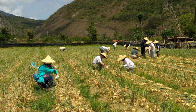 (沈董事長夫婦一馬當先,在烈陽底下採收洋蔥。)