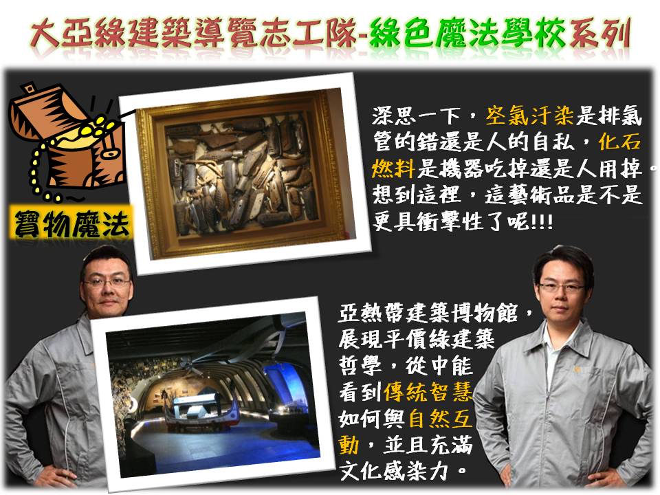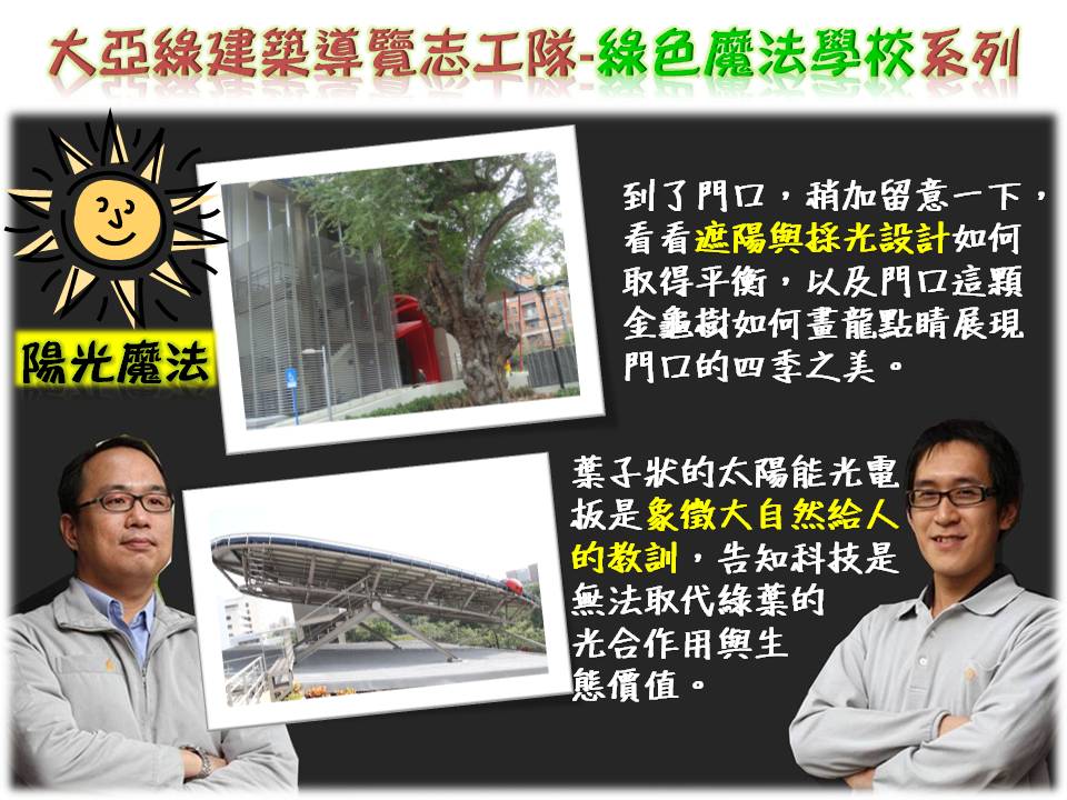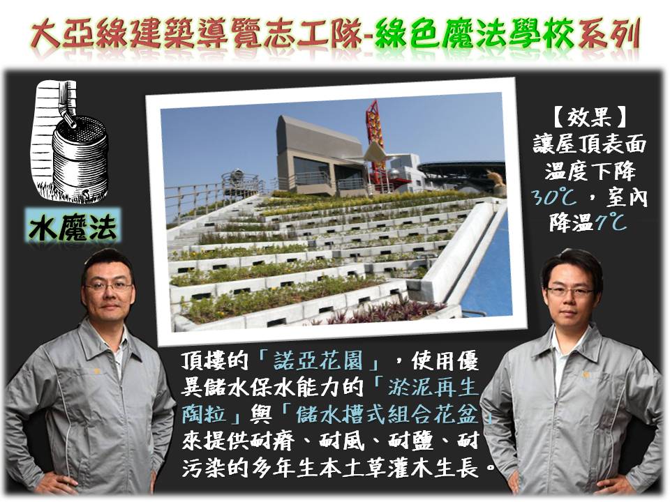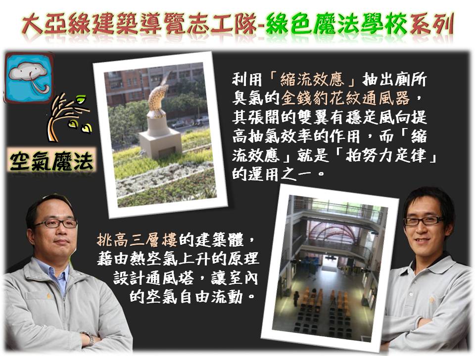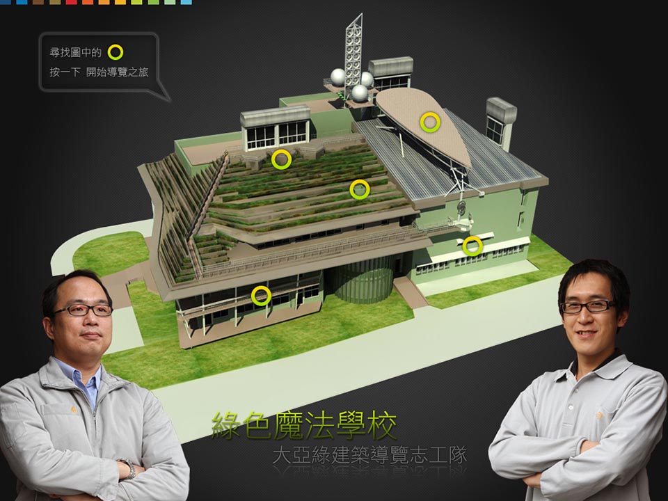 這座世界第一的「亞熱帶綠建築教育中心」,由綠建築大師林憲德教授全程設計監造,並延攬了一群對建築的光、熱、風等學有專精的頂尖研究團隊,以及來自台灣四面八方的企業綠達人,將百種以上的綠觀念、綠技術、綠建材等許多綠色創舉完美地呈現。接下來就交給大亞電纜的四位綠建築導覽志工來為網友們訴說「綠色魔法學校」施展了哪些魔法!