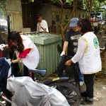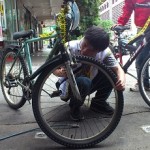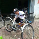 [DSC_0192s] 志工們也被余理事長的熱情與努力所感動,午餐後馬上自動分配工作。男性志工人手牽一台自行車,徒步前往鄰近的自行車行。檢查胎壓、煞車、變速器,不論是更換零件或上油保養,眾人七手八腳,很快十多輛自行車又能重新上路。同時也為每輛車加裝了置物籃,方便日後旅行者使用。女性志工則協助玉山旅社外圍環境的清潔:疏通排水溝以及清理鄰近公園的落果,減少蚊繩滋生。最後,再由修剪日漸壓迫旅社屋頂的樹木枝幹。不到兩小時,志工們解決了困擾余理事長多時的問題。