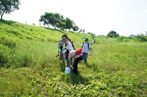 [SONY DSC] 大亞企業志工隊先協助清理工作站附近環境,接下來便是這次工作的重頭戲:整修人行步道。由於大甲濕地屬於人工溼地,生態尚未健全。其中外來植物擴展極為快速,從堤防通往溼地的步道很容易就被淹沒。志工們頂著大太陽手工一一摘除田菁、銀合歡。同時志工們沿著步道挖洞立桿,並在桿上拉繩固定作為標示。太陽炙熱,志工們雖然汗水淋漓卻沒有抱怨,反倒是笑容滿滿。